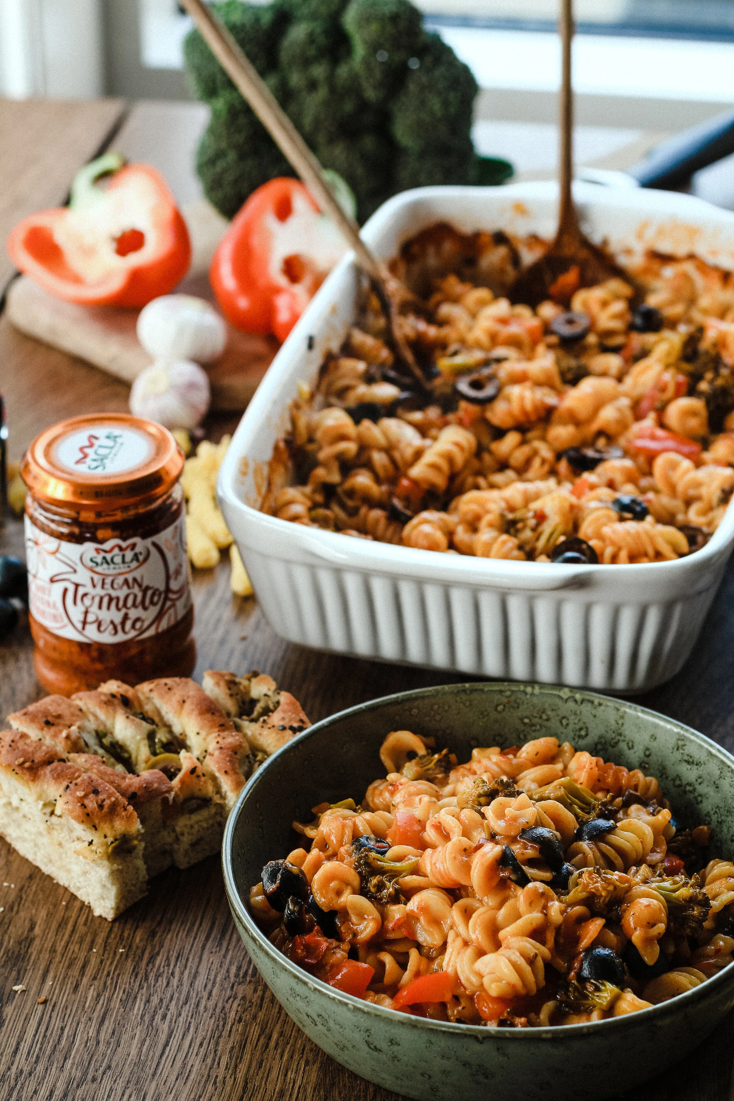 Ég ákvað að setja smá vegan ost yfir réttinn í lokin til að gera hann extra djúsí en það má alveg sleppa því. Ég notaði rauða pestóið frá Sacla Italia þar sem það er lang uppáhalds pestóið mitt. Það er þó alveg hægt að leika sér með réttinn eins og hver og einn vill, nota til dæmis grænt pestó og það grænmeti sem til er. Þetta getur verið alveg fullkomin réttur til að nota restar úr ísskápnum í.